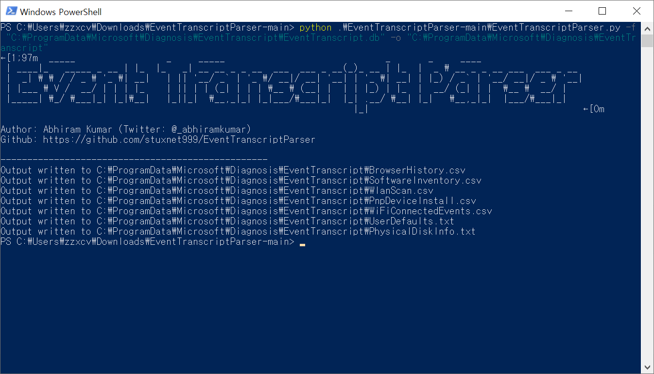 EventTranscriptParser 툴을 사용해 세부 정보를 추출할 수 있다. 사용법은 github에 나와있으므로 다음 링크를 참고하여 설치한 후 사용해보자.