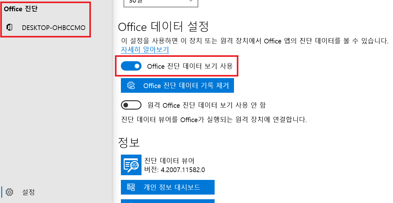 한가지 특이 사항으로는 설정에서 'Office 진단 데이터 보기 사용'을 활성화하면 Office 진단 데이터를 볼 수 있다는데, 필자는 별다른 이벤트를 확인하지 못하였다...ㅠㅠ