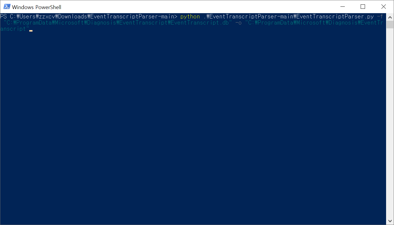 python EventTranscriptParser.py -f "EventTranscript.db 파일" -o "추출 파일 생성 위치"