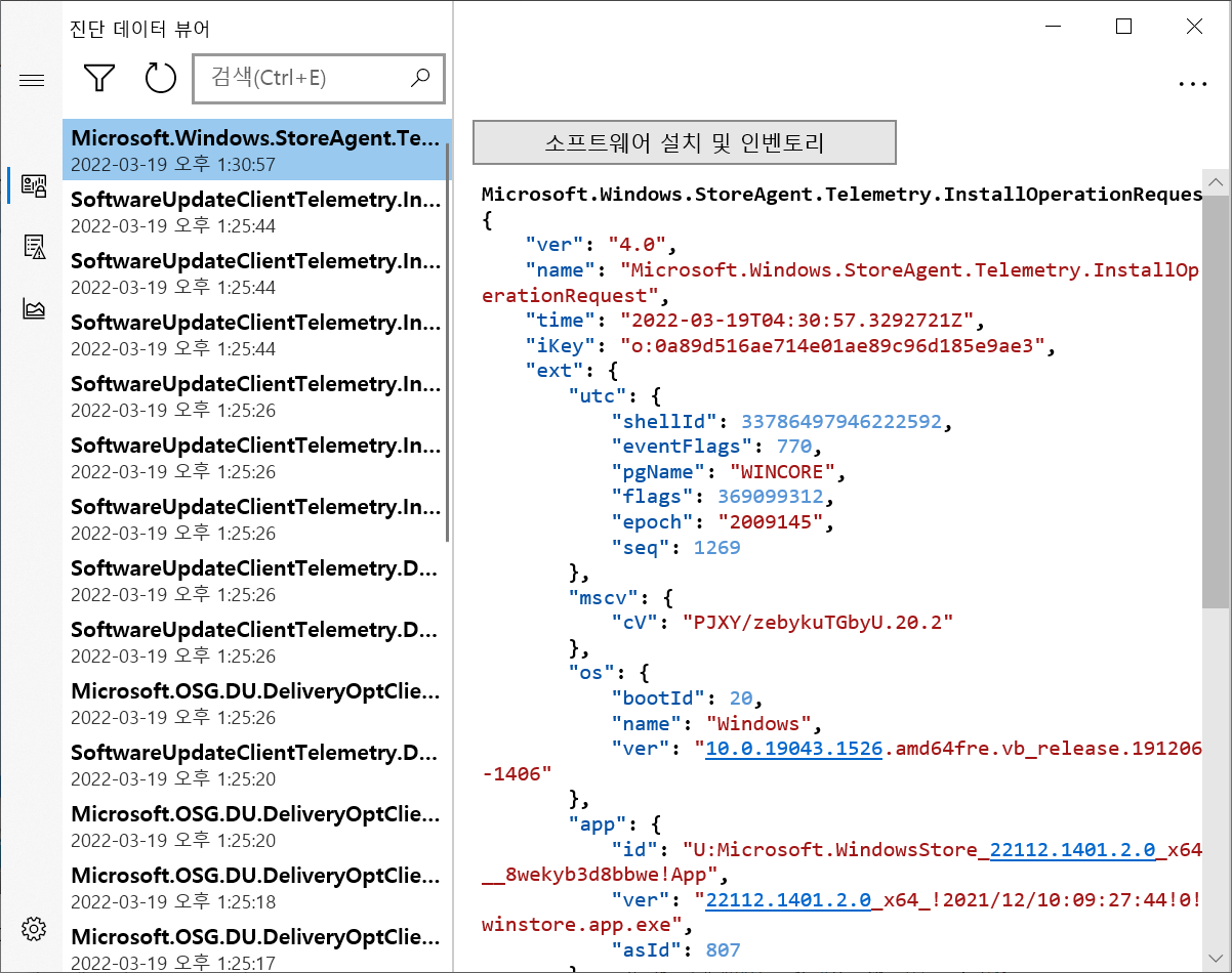 진단 데이터는 이전 이벤트 기록도 살펴볼 수가 있는데, 가령 예를들자면 좀 전 Microsoft Store에서 받았던 Diagnostic Data Viewer 설치 이벤트 정보도 기록이 되었다.