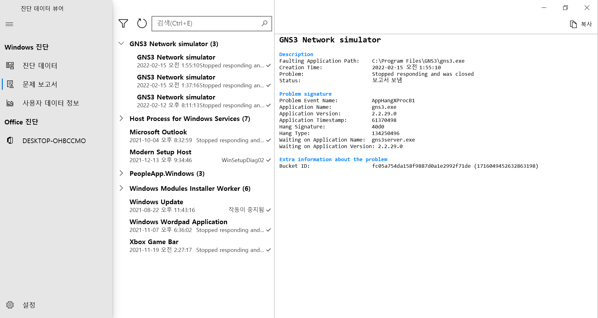 위의 문제 보고서는 갑작스럽게 작동하지 않는 응용 프로그램들이 기록된다. 문제 보고서는 다음 위치에 존재한다.
